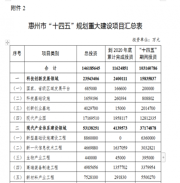 6月3日,惠州市政府正式對(duì)外公布《惠州市國(guó)民經(jīng)濟(jì)和社會(huì)發(fā)展第十四個(gè)五年規(guī)劃和2035年遠(yuǎn)景目標(biāo)綱要》(下稱(chēng)《綱要》)。其中明確提出,“十四五”期間規(guī)劃建設(shè)重大項(xiàng)目312宗,計(jì)劃總投資近1.5萬(wàn)億元,“十四五”期間計(jì)劃投資10316億元。