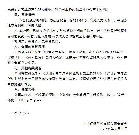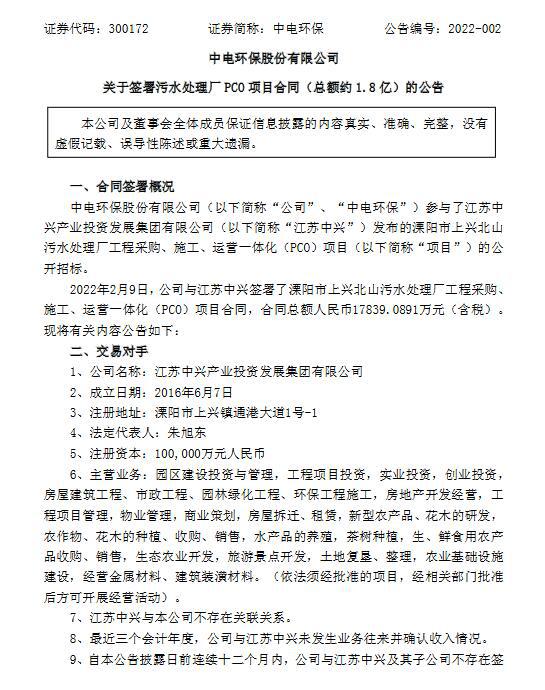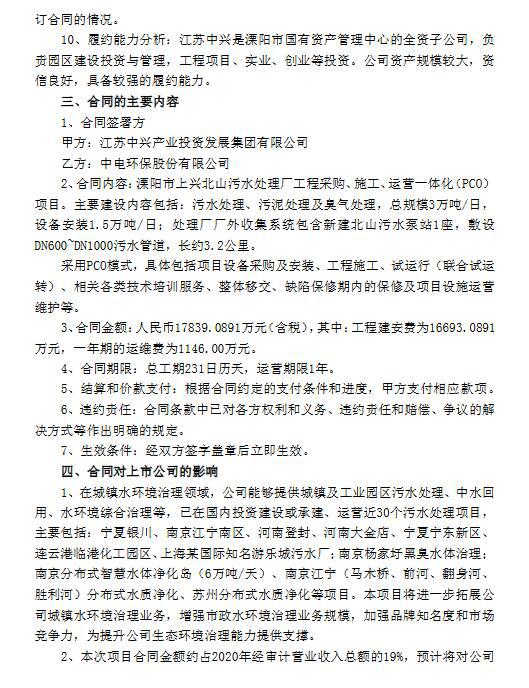 2022年2月9日,公司與江蘇中興簽署了溧陽市上興北山污水處理廠工程采購、施工、運(yùn)營一體化(PCO)項(xiàng)目合同,合同總額人民幣約1.78億元(含稅)。